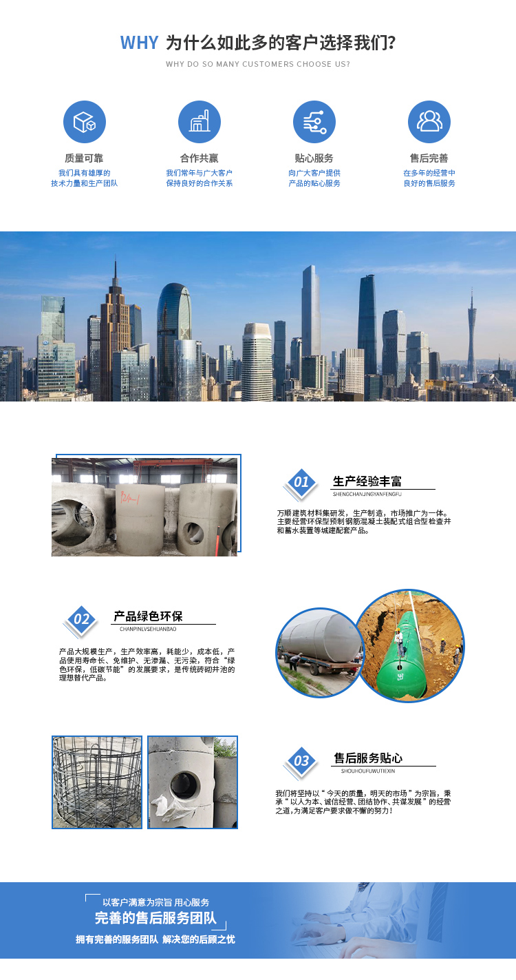 安徽萬(wàn)渠建筑科技有限公司是集研發(fā),生產(chǎn)制造,市場(chǎng)推廣為一體的綜合性企業(yè)。公司主要經(jīng)營(yíng)環(huán)保型預(yù)制鋼筋混凝土裝配式組合型檢查井和蓄水裝置等城建配套產(chǎn)品。產(chǎn)品生產(chǎn)過(guò)程采用獨(dú)特的生產(chǎn)工藝,機(jī)械化流水作業(yè)。產(chǎn)品大規(guī)模生產(chǎn),生產(chǎn)效率高,耗能少,成本低,產(chǎn)品使用壽命長(zhǎng)、免維護(hù)、無(wú)滲漏、無(wú)污染,符合“綠色環(huán)保,低碳節(jié)能”的發(fā)展要求,是傳統(tǒng)磚砌井池的理想替代產(chǎn)品。